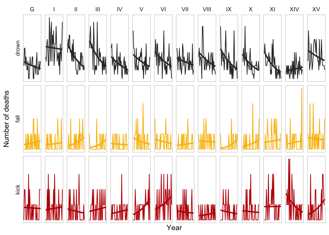 This fits a GLM to each, so we can see the trend for each corps more easily. And lo, there is clear difference. For example, corps XIV stands alone in having increased deaths by drowning over time, but showed the biggest improvement in deaths by horse kick. That said, these are visibly not the best fits - the amount of data for each corp is quite low.
